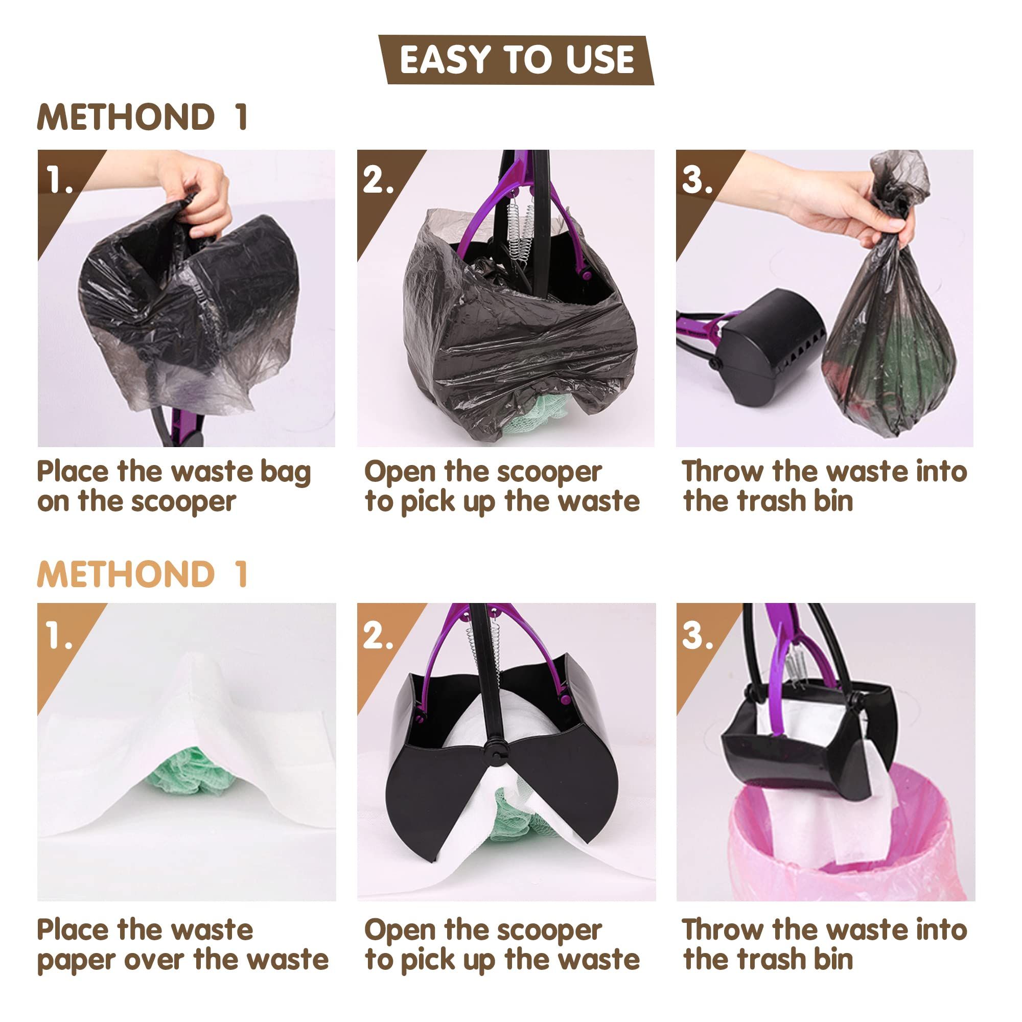 2.Excellent Durability. The heavy duty pooper scooper for walks is made of reliable polypropylene and ABS plastic, which are easy to clean and safe for pets and the environment. These dog pooper scoopers for small dogs are equipped with sturdy steel springs that will last a long time.