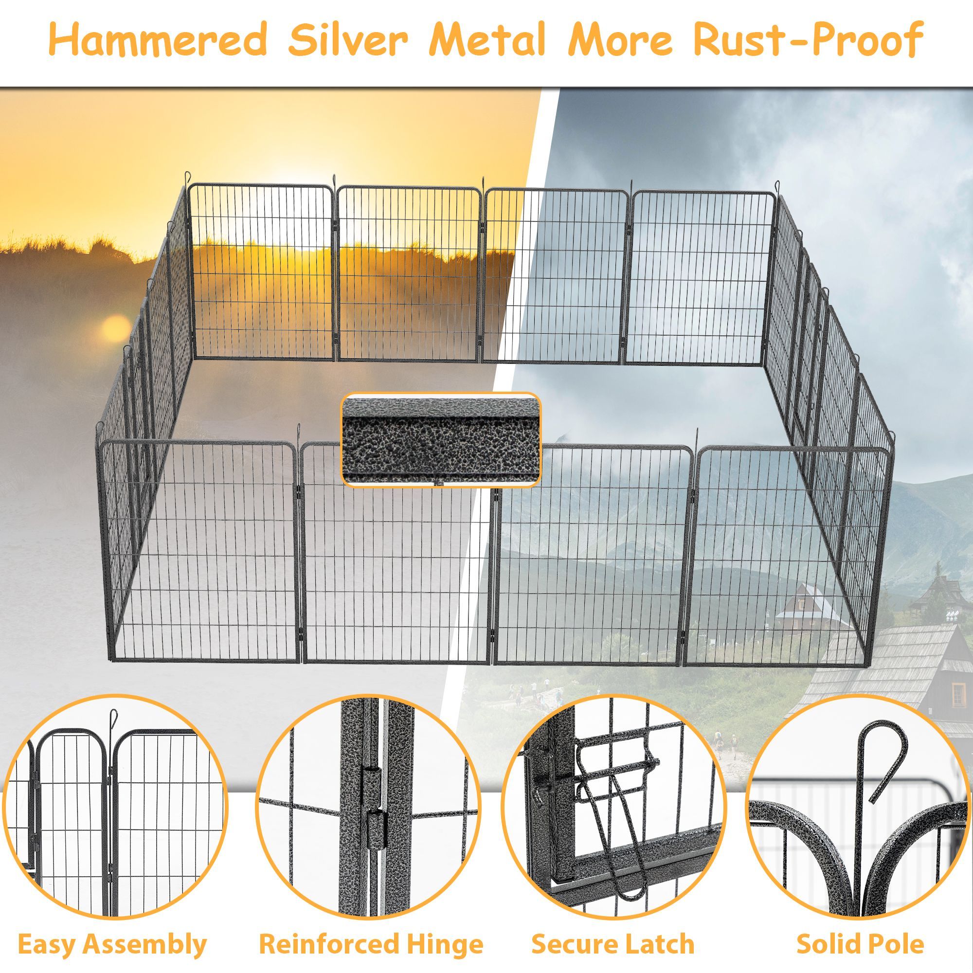 Durable & Premium Material:The dog playpen for large dogs is made of high quality wrough iron and features double-coated finish that makes it highly rust-resistant and waterproof, ideal for RV camping, traveling, or use in the yard. The dog fence with protective pads on each panel and flat stakes make it suitable to use indoor. Perfect indoor and outdoor dog play pen for resting and playing.